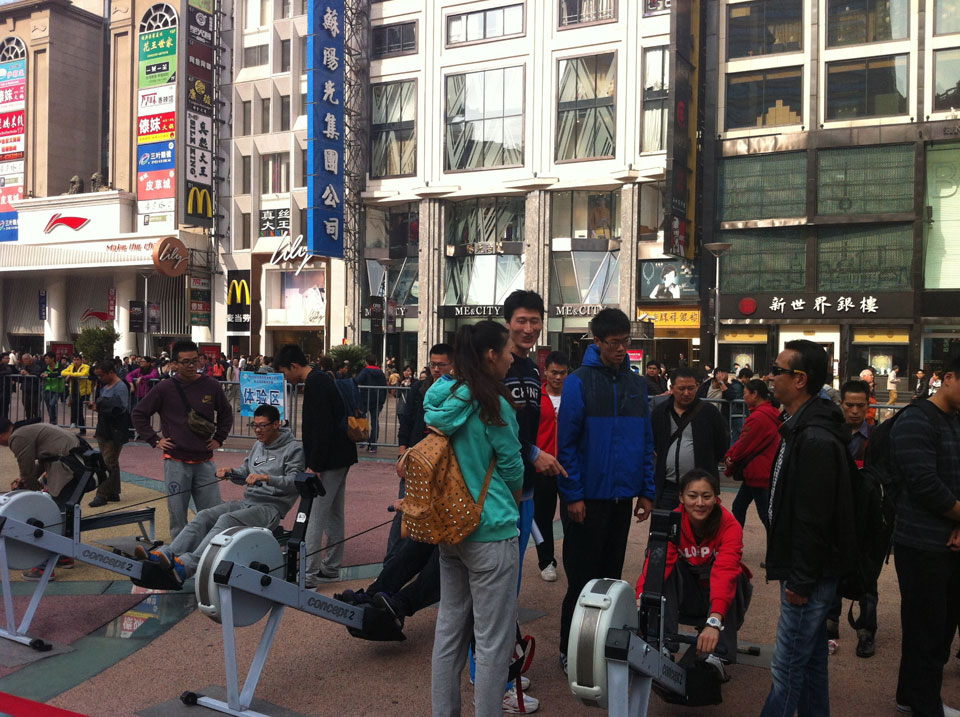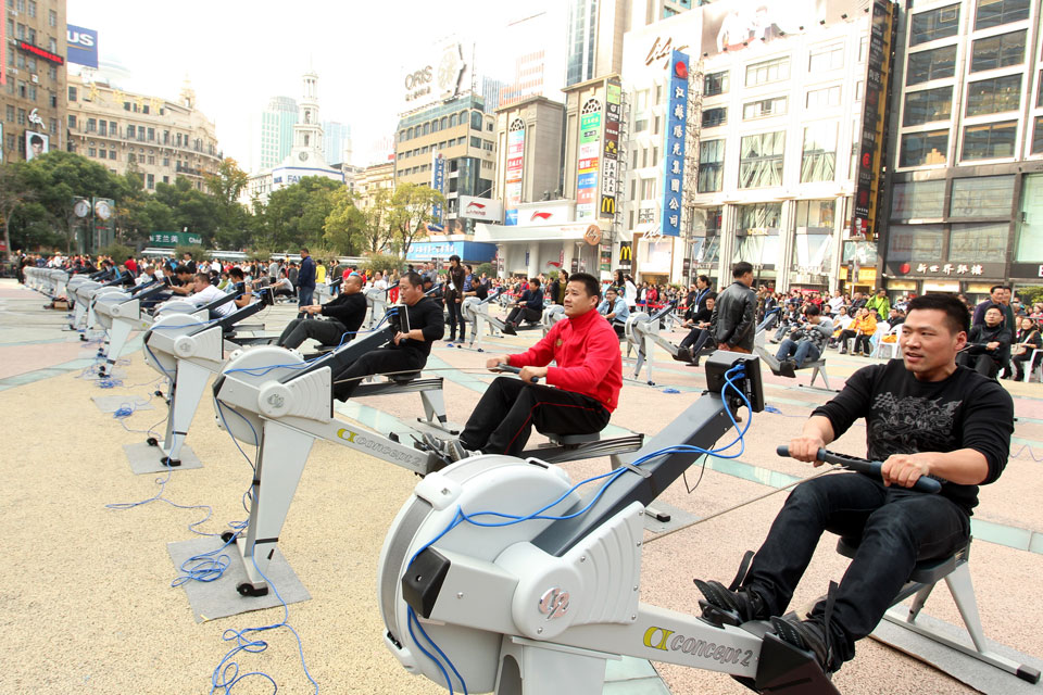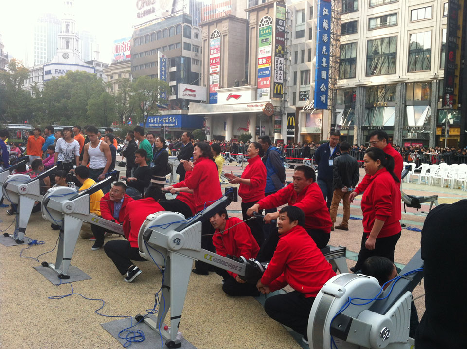 随着市民体育大联赛进入最后一个月的冲刺阶段,各单项总决赛相继展开,高潮迭起。今天(11月23日)下午,市民体育大联赛陆上划船器总决赛在南京路步行街世纪广场鸣笛开赛。来自全市市级机关、总工会、区县、行业系统、高校的40支队伍,近500名市民选手和青少年运动员同场竞技,共同体验划船器运动带来的快乐。